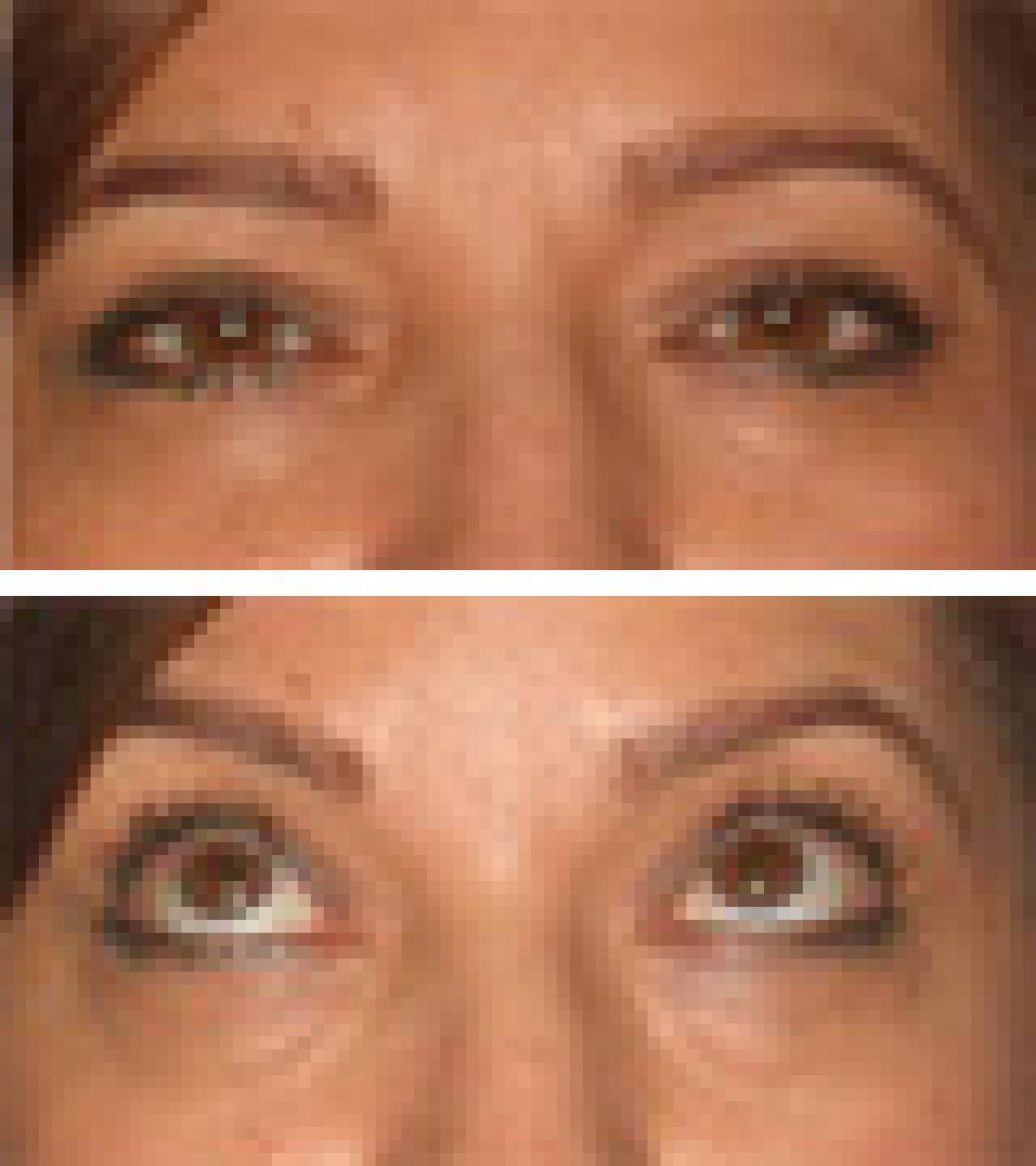 Este caso muestra a una mujer de 45 años que deseaba abordar sus párpados superiores "pesados" y el hecho de que los demás a menudo la percibían como enojada.